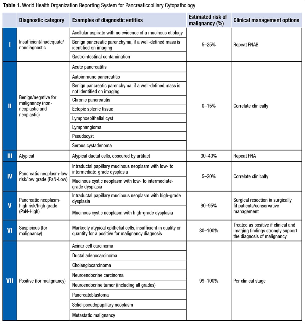 Recently, the World Health Organization, International Academy of Cytology, and International Agency for Research on Cancer presented a standardized reporting of pancreaticobiliary cytopathology with a seven-tiered system by revising the PSC system for reporting pancreaticobiliary cytology.9 This reporting system is one of the first in a series from various body sites that mirror the WHO Classification of Tumors series and provides an evidence-based terminology system with associated risk of malignancy and diagnostic management recommendation per diagnostic category. The WHO Reporting System for Pancreaticobiliary Cytopathology revises the PSC system and replaces the six-tiered system with a seven-tiered system including “insufficient/inadequate/nondiagnostic,” “benign/negative for malignancy,” “atypical,” “pancreaticobiliary neoplasm-low risk/low grade (PaN-Low),” “pancreaticobiliary neoplasm-high risk/high grade (PaN-High),” “suspicious for malignancy,” and “positive for malignancy” (Table 1).