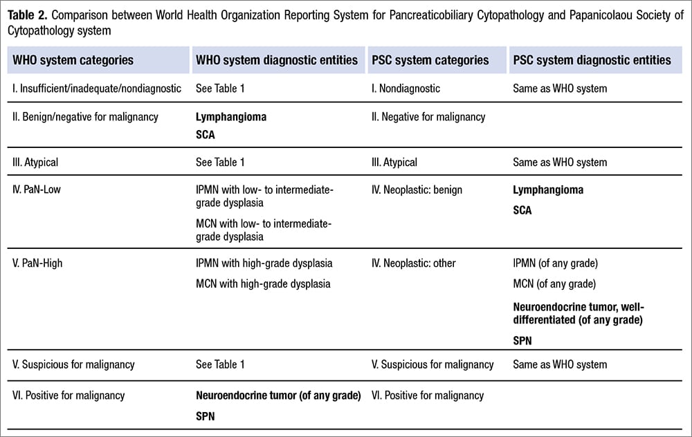 Comparison between WHO and PSC systems (Table 2). One major change in the WHO system, as compared with the PSC system, is the classification of neoplasia. In the PSC system, there is a single category for neoplasms including “benign” (serous cystadenoma and lymphangioma) and “other” (IPMNs of any grade, MCNs of any grade, PanNETs, and SPNs). In the WHO system, these neoplasms are classified into four categories: benign/negative for malignancy (serous cystadenoma and lymphangioma), PaN-Low (IPMN/MCN with low- to intermediate-grade dysplasia), PaN-High (IPMN/MCN with high-grade dysplasia), and positive for malignancy (PanNETs and SPNs). Additionally, pancreatic FNAs with findings suspicious for a well-differentiated PanNET or SPN that are categorized as atypical in the PSC system are now reclassified as suspicious for malignancy per the WHO system recommendation.