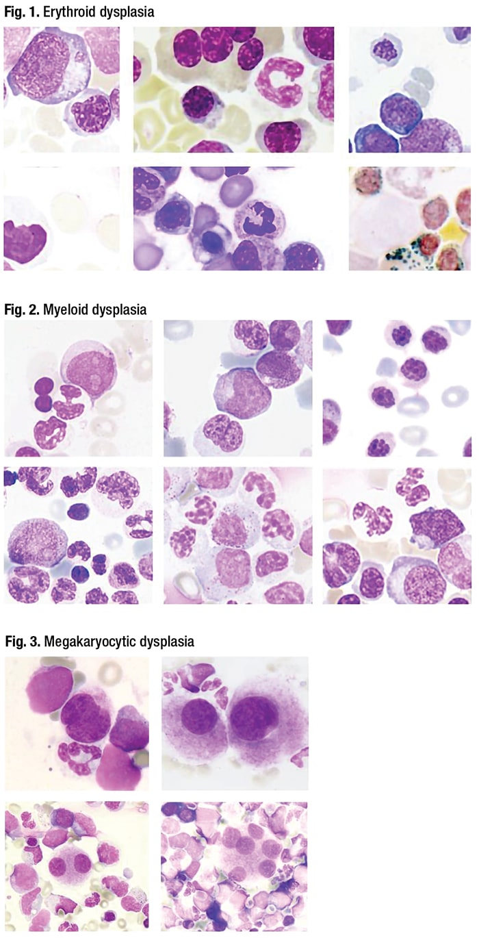 Dysplasia is thought of in three lineages: erythroid, myeloid, and megakaryocytic (Figs. 1–3). Here, too, there are caveats, he said. “Dysplasia is not specific for MDS, despite the name. There are many non-neoplastic mimics that can cause dysplasia.” There also are examples in the literature of dysplastic morphology in “normal” volunteers, and dysplasia can have low reproducibility among observers. Erythroid dysplasia is the least specific morphologic finding for MDS, he said, “in part because many other things can cause erythroid dysplasia.”