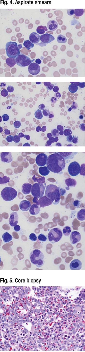 The core biopsy (Fig. 5) was hypercellular, with many immature-appearing cells—“possibly erythroids, based on the chromatin quality and multiple nucleoli,” he said. Cytogenetics came back with a normal karyotype, and flow cytometry showed no increase in blasts or antigen aberrancy. NGS was pending. A gastric biopsy identified autoimmune multifocal atrophic gastritis. Serum testing found low serum vitamin B12 levels (76 pg/mL) and anti-intrinsic factor antibodies. “So the bone marrow diagnosis in this case is relative erythroid hyperplasia secondary to B12 deficiency.”
