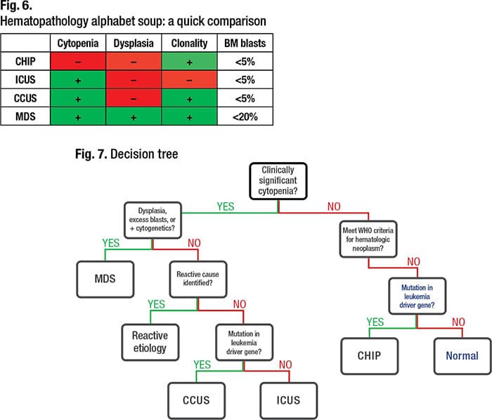 Persistent unexplained cytopenias in patients who do not meet diagnostic criteria for MDS may be classified as idiopathic cytopenia of undetermined significance (ICUS) or clonal cytopenia of undetermined significance (CCUS). In ICUS, “there’s no molecular evidence of clonality and no evidence of malignancy—all we have is an unexplained cytopenia,” she said. CCUS exhibits both an unexplained cytopenia and a somatic mutation in a leukemia associated gene. “But these patients do not meet WHO diagnostic criteria for a hematologic malignancy.” It’s important to identify patients with CCUS, “because these patients do have an increased risk of progression to a myeloid neoplasm,” with a five-year cumulative probability of progression of 82 percent, versus nine percent for ICUS (Malcovati L, et al. Blood. 2017;129[25]:3371–3378). The key distinguishing features between CHIP, ICUS, CCUS, and MDS are summarized in Fig. 6, and Fig. 7 illustrates a practical decision tree when evaluating cases.