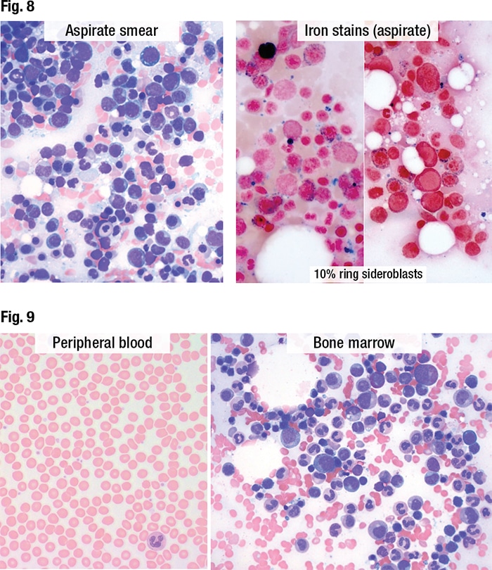 [dropcap]D[/dropcap]r. Dunlap shared the case of a 79-year-old female with progressive anemia. The CBC showed a leukopenia with absolute neutropenia (WBC 2.5, ANC 1.3), macrocytic anemia (Hgb 7.6, MCV 102), and a normal platelet count (179). “There was no neutrophil dysplasia in the peripheral blood and no circulating blasts,” she said. The bone marrow aspirate exhibited erythroid dysplasia (Fig. 8). “Myeloid precursors also were dysplastic—many appeared hypogranular,” she said. “There were occasional blasts but overall they were less than five percent.” The iron stain showed ring sideroblasts enumerated at 10 percent. Cytogenetics and flow cytometry were normal. NGS identified two mutations: SF3B1 K700E and a TET2 H800fs frameshift mutation. The final diagnosis was MDS with ring sideroblasts (MDS-RS). As previously discussed, a diagnosis of MDS-RS can be made if there are at least five percent RS when an SF3B1 mutation is present.