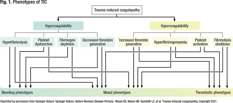 There is no standard definition for trauma-induced coagulopathy, a term established in 2010, but it refers to “abnormal coagulation capacity attributable to trauma,” Dr. Karp said. It manifests with a spectrum of phenotypes—anything from hypocoagulation to hypercoagulation (Fig. 1) (Moore EE, et al. Nat Rev Dis Primers. 2021;7[1]:30). What results is a function of many interactive factors, she said. “Things like tissue injury, the presence or absence of shock, and time from injury.”