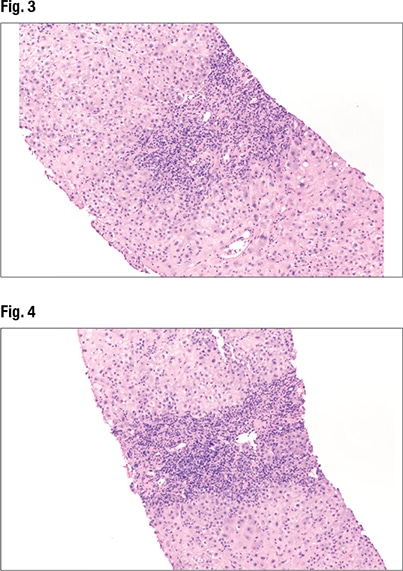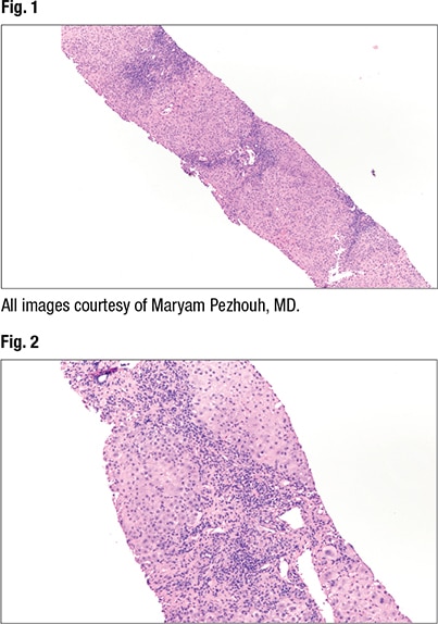 Histologically, there will be patchy or often moderate portal tract inflammation, and there can be bile duct lymphocytosis and injury. “Look for both—not only lymphocytes in the bile duct, but you want to see the injury,” Dr. Pezhouh said. In about 40 percent of cases granulomas can be seen, either in the lobules or in the portal. “So it’s not a dealbreaker if you don’t see granulomas.” (Dr. Pezhouh provides a sample report after each case.)
