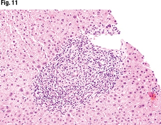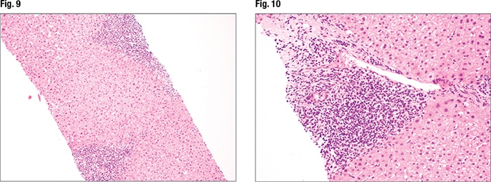 [dropcap]I[/dropcap]n Fig. 7 is an image from a second case. “This is an adequate biopsy,” Dr. Pezhouh said. “I have at least three cores of liver; they seem long, they don’t seem fragmented.” There is inflammation and it appears to be in the portal tracts. The lobular inflammation looks slightly dispersed, “but at this power it’s hard to see lobular activity.” At slightly higher power (Figs. 8 and 9), “again I see inflammation in the portal tracts but not much in the lobules. The portal tracts [right and left sides of liver core] are expanded by inflammation.” On higher power (Fig. 10) there are areas that show bile duct injury. Lymphocytes are rimming around and in between bile duct epithelium, causing bile duct injury, she said, indicating an irregular bile duct (mid-left). Another bile duct (Fig. 11, center) looks rounder, “but still you see lymphocytes in between the epithelium and it doesn’t look happy; it’s a little pinkish.” It seems that bile ductitis is present.