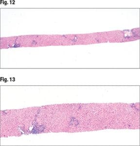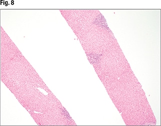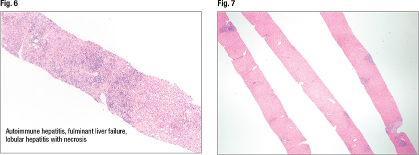 In Fig. 6 is autoimmune hepatitis with fulminant liver failure and areas of necrosis (left side of liver core). In such cases she notes the percentage of necrosis. “And I correlate with the laboratory findings.”