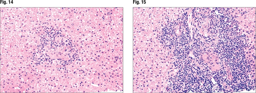 [dropcap]D[/dropcap]r. Pezhouh presented a third case, one in which portal tract and lobular inflammation can be seen (Figs. 12 and 13), as can granulomas in the lobules (Fig. 14, center). “So basically I had a hepatitic pattern of injury and granulomas,” and granulomas have a long list of differentials: primary biliary cholangitis; sarcoidosis, common variable immunodeficiency, and other systemic granulomatous diseases; drug effect; infection; paraneoplastic syndrome. And sometimes they can be idiopathic, she said.