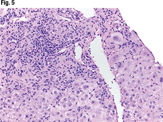 Under higher power (Fig. 3), interface hepatitis—in which inflammation enters the lobules—can be seen, as can inflammation in the portal tracts. In Fig. 4 (center), “there’s some spillage of the inflammation in the lobules but it’s mainly staying in the portal tracts at this point.” Under higher power (Fig. 5), “there are tons of plasma cells,” and lymphocytes are seen in the hepatocytes. “It’s somewhat rosetting the hepatocytes” (mid-left, bottom). “So there’s inflammation in the portal tracts, it’s spilling out tons of plasma cells, and there’s a selection of them going into the lobules and encasing the hepatocytes.”