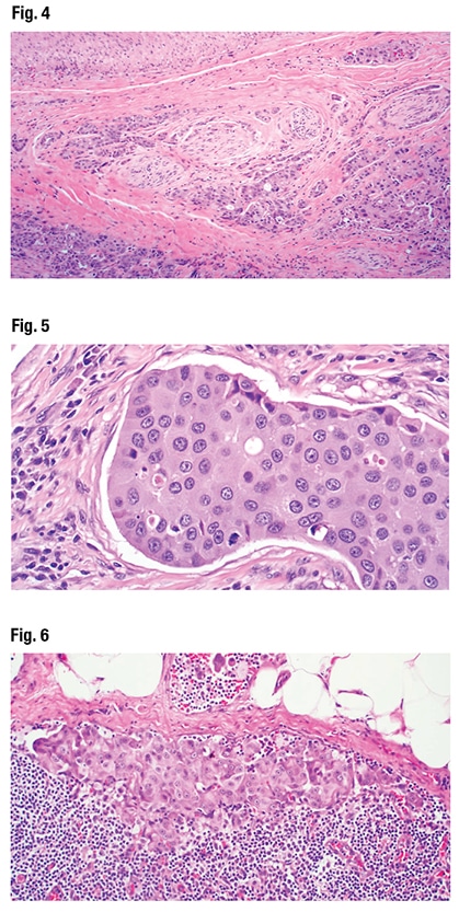 In Fig. 3 Dr. Bishop noted the infiltrative nests and cords of cells, and (at bottom and top right) cystic-like areas with “interesting architecture, this lollipop projecting into the cysts,” and a kind of “Roman bridging, and an apocrine-looking snout formation.” Perineural invasion was not difficult to find (Fig. 4). “So this is a very aggressive, high-grade tumor,” Dr. Bishop said.