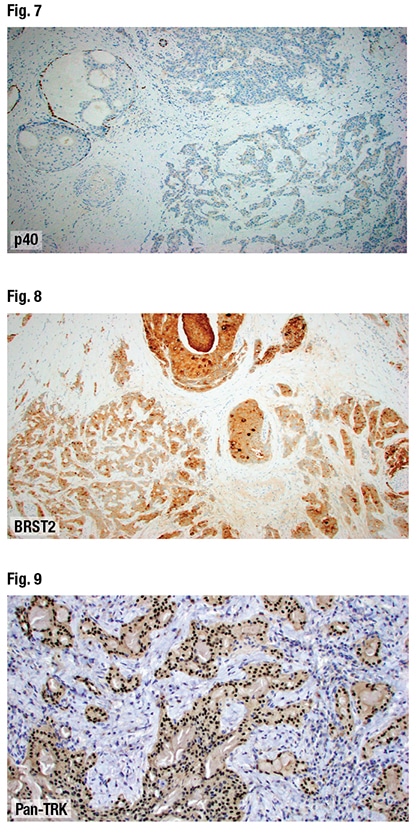 It was sent out for next-generation sequencing to look for targetable alterations, “and this surprisingly had an ETV6-NTRK3 fusion, which was unexpected because this is the defining fusion for a mammary analogue secretory carcinoma.” Although not required, pan-TRK immunohistochemistry was done (Fig. 9). “And sure enough, this had diffuse nuclear staining.” (ETV6 rearrangement studies also could have been done, he noted, and they too would have been positive.) “So the final diagnosis in this case ends up being a high-grade salivary duct carcinoma harboring an ETV6-NTRK3 fusion. A very unusual case,” Dr. Bishop said.