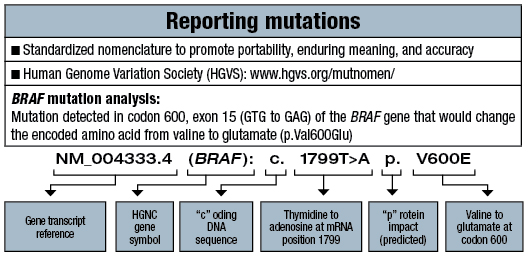 Second, and more complicated, what does the difference mean in clinical terms? “At the very least, you have to translate the data in the vcf file, which is given in genomic coordinates, into something meaningful in terms of genes,” he said. In the vcf file, four columns give the chromosome number (e.g. 3), nucleotide position (e.g. 1111333333), expected nucleotide at that position (e.g. A), and nucleotide found in the patient’s genome at that position (e.g. T). In the standardized form proposed by the Human Genome Variation Society, the above information would read: g.1111333333A>T, but there are also guidelines for gene and protein level annotations that make the reporting of a given sequence change more informative and meaningful (see “Reporting mutations”).