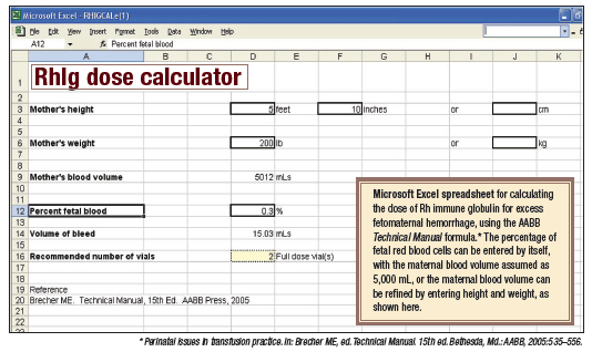 The Transfusion Medicine Resource Committee, in an effort Dr. Brecher led, responded by creating an online RhIg Dose Calculator. It’s a Microsoft Excel program that requires only that users plug in the numbers—the dose is then calculated automatically. The calculator is posted on the CAP Web site (www.cap.org, under Committees & Leadership, Transfusion Medicine Resource Committee, and then Transfusion Medicine Topic Center), and it does not require validation as LIS software, says S. Gerald Sandler, MD, a TMRC member and lead author of the Transfusion commentary. Most importantly, he says, the calculator works.
