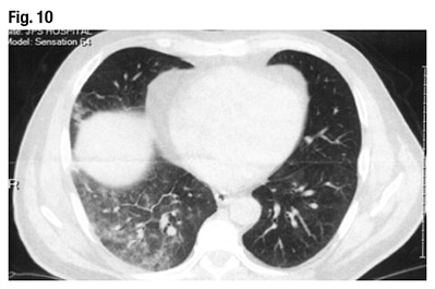 Dr. Larsen displayed the CT scan of the patient’s lungs (Fig. 10). “Even I can recognize there’s something wrong in the right lung,” he said. “This is just diaphragm, of course, but there is some sort of patchy, ground glass infiltrate in the right lung and, looking a little more closely, there probably is even some of the same process going on in the left lung, just a lot more subtle.” The problem appears to be bilateral.