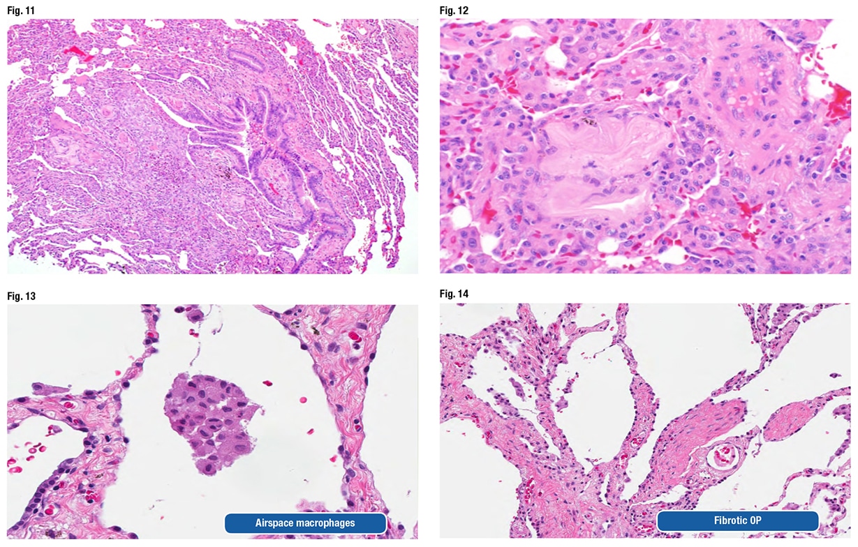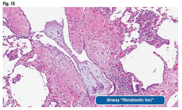 The pathologic features can be nonspecific and variable, as they were in this case, Dr. Larsen said. Airspace macrophages can appear foamy and even resemble drug-reaction macrophages (Fig. 13). “You can see organizing pneumonia” and sometimes fibrosing organizing pneumonia (Fig. 14). Fibroblast foci might be observed around the airways. “They look like fibroblast foci in a fibrotic ILD like a UIP [usual interstitial pneumonia] pattern-type fibroblast focus, but they are in the wrong spot,” he said. “They are around the airways.” (Fig. 15).