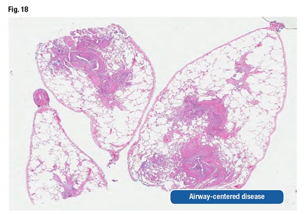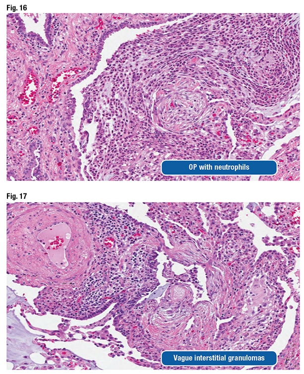 The pathologist could also see acute and chronic bronchiolitis, vasculopathy, vague interstitial granulomas, and organizing pneumonia with neutrophils. “You sort of wonder if that has secondary infection related to aspiration,” he said (Figs. 16 and 17).