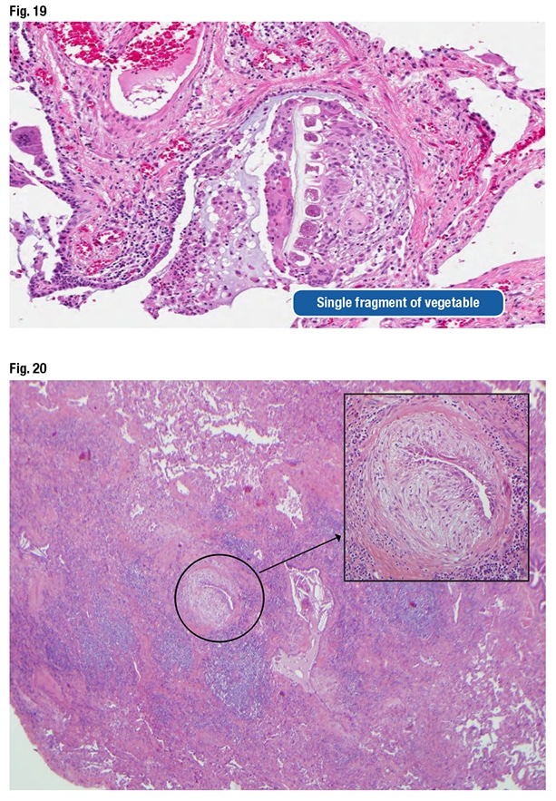 Dr. Larsen presented an image of prominent airway disease at low power (Fig. 18). “When I see abnormalities like that, aspiration gets really high on my differential. In this particular case, only a single fragment of aspirated vegetable material was seen, even though there were all those other changes,” he said, referring to a second image (Fig. 19). “You have got to search for this, but in an appropriate context, this is absolutely diagnostic of aspiration as the cause.”