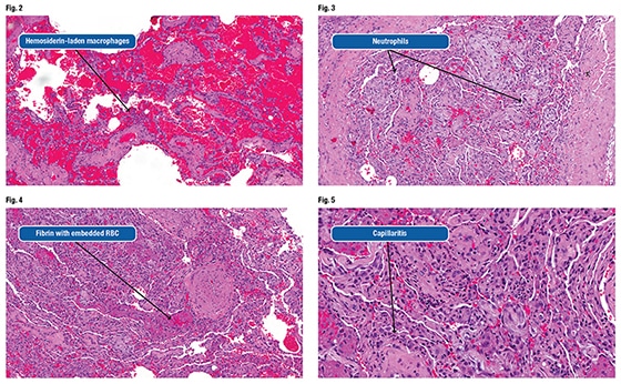 He noted a small amount of fibrin in the area of the organizing pneumonia and many neutrophils within the interstitium (Fig. 3). When pathologists see subtle neutrophils within what is otherwise an organizing pneumonia or acute fibrinous lung injury process, they should begin thinking about diffuse alveolar hemorrhage, Dr. Smith advises.