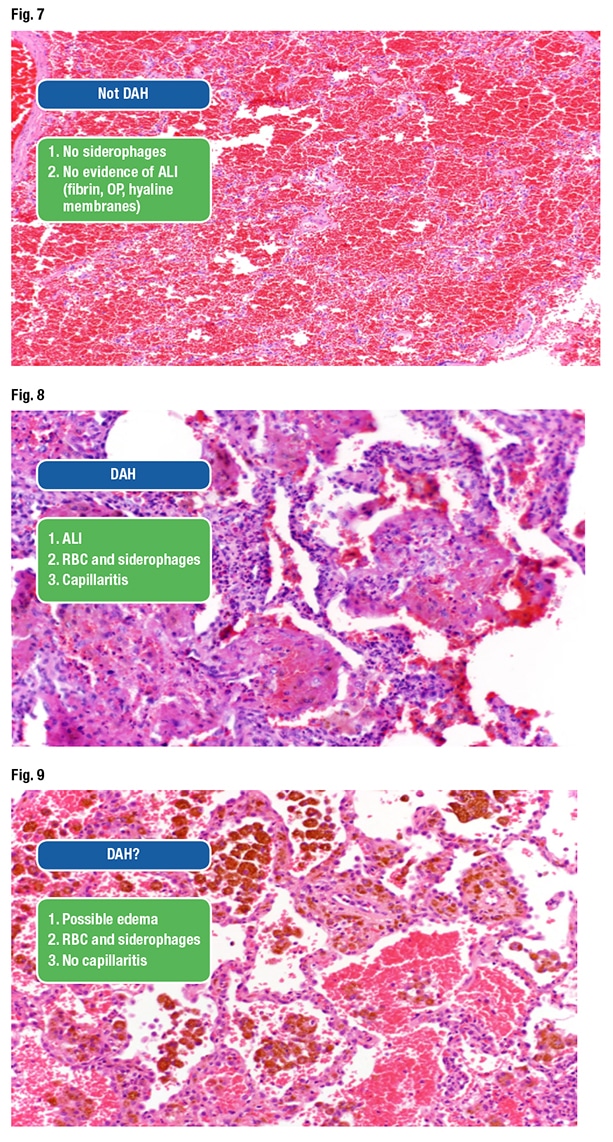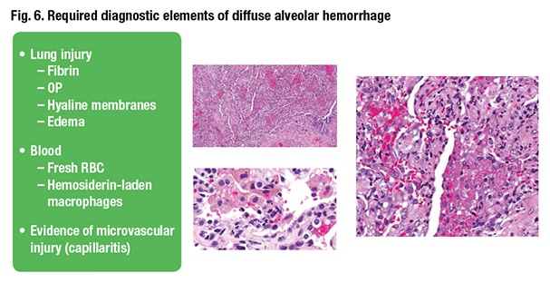 What histological criteria does the pathologist have to see on the biopsy to diagnose DAH? The first, Dr. Smith said, is indication of acute lung injury. “If you do not have any lung injury, you do not have diffuse alveolar hemorrhage. I don’t care how many hemosiderin-laden macrophages you see.” The second criterion is histologic evidence of blood where it shouldn’t be in the airspaces. That can be hemosiderin-laden macrophages or fresh red blood cells. Last is evidence of microvascular injury or capillaritis (Fig. 6).