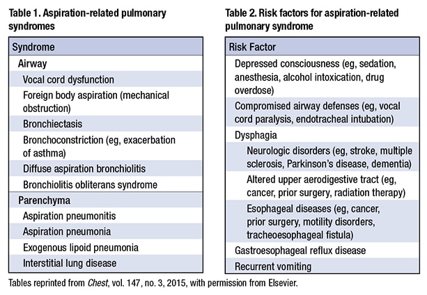 All of the risk factors listed in Table 2 (Hu X, et al. Chest. 2015;147[3]:815–823) should be apparent, Dr. Larsen said: dysphagia, altered mental status owing to excessive alcohol, neurologic disorders, esophageal disorders, vomiting, GERD, etc. “Lots of things can lead to aspiration,” he said. “So always include aspiration in your differential for airway-centered inflammatory or fibrotic processes.”