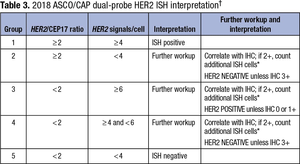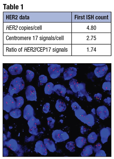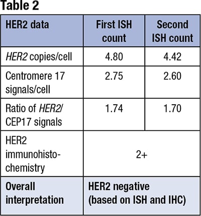 If the IHC result is definitive, overall interpretation is based on that IHC result. In other words, if HER2 IHC is 0 or 1+, the overall interpretation is negative. If HER2 IHC is 3+, the overall interpretation is positive.1 If HER2 IHC is 2+, as it so often is in cases sent for ISH, additional ISH cells should be counted by a second observer, blinded to the original ISH results, but with attention to the 2+ or strongest staining areas of the carcinoma (Table 2 for this example). If the result remains the same, the overall interpretation is HER2 negative, as delineated (Table 3).1
