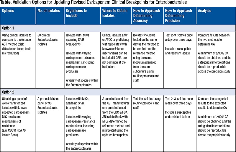 In general, a validation study for a breakpoint update should be minimal as compared with a study performed when implementing a brand-new AST system in the laboratory. In both cases, a study verifies (as the name implies) the performance characteristic established by the manufacturer. For breakpoints that have not yet been FDA cleared on a system, the manufacturer cannot provide performance data to the laboratory, so the laboratory should establish, in advance of the study, what acceptable performance looks like and validate that its test can achieve that performance. In most cases, this is greater than 89 percent categorical agreement, although laboratories may need to be flexible, at the laboratory director’s discretion, for some drug/bug combinations if performance falls below this. While typical validation studies include evaluations of accuracy (agreement) and precision (reproducibility) of essential agreement and categorical agreement, essential agreement testing is not needed since it was determined for the dilution range on the panel when the laboratory first implemented the test. The Table describes two options for updating the revised carbapenem clinical breakpoints for Enterobacterales. Accuracy testing across 30 isolates with a variety of S/I/R results is generally viewed as sufficient, with comparison to a reference or known result. Ideally, the lab would also test a variety of species within the Enterobacterales and include a variety of resistance mechanisms, such as carbapenem-resistant isolates that do and do not produce carbapenemases, when verifying the carbapenem breakpoints. The Centers for Disease Control and Prevention and FDA Antibiotic Resistance Isolate Bank is an excellent resource for such isolates since the isolates are well characterized and available at no charge.5 Even more useful is a specific panel (the CDC’s Enterobacteriaceae Carbapenem Breakpoint Panel) designed to validate the carbapenem breakpoints for Enterobacterales, which takes the guesswork out of which isolates to choose for the validation study. The CDC isolates are sent to the laboratory with a known reference MIC and interpretation by current breakpoints. Validation of accuracy can, therefore, be as simple as testing the CDC isolates on the lab’s AST system and comparing the interpretation (with current breakpoints) from that system with the interpretation provided by the CDC.
