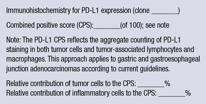 Reporting. Although a CPS ≥ 1 would meet the FDA-approved PD-L1 IHC criterion for use of pembrolizumab in gastric and GEJ adenocarcinoma, as with other predictive markers, we recommend the actual score be indicated in the pathology report. Our institution also reports the relative contribution to the CPS by tumor cells versus immune cells (lymphocytes and macrophages). An example reporting format is as follows: