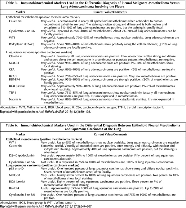- Husain AN, Colby TV, Ordóñez NG, et al. Guidelines for pathologic diagnosis of malignant mesothelioma: 2017 update of the consensus statement from the International Mesothelioma Interest Group. Arch Pathol Lab Med. 2018;142(1):89–108.