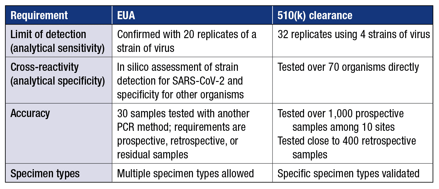 A. The requirements for an EUA are magnitudes less than those for 510(k) clearance. The “typical” test on the market that detects a viral pathogen has 510(k) clearance from the Food and Drug Administration, but SARS-CoV-2 tests do not. There wasn’t sufficient time for the detailed evaluation required for a 510(k) clearance. An example of the requirements to obtain an EUA for a PCR test for SARS-CoV-2 compared with a 510(k) clearance for a PCR test for another virus is shown (see table). This information is taken from one vendor but generalized to provide estimates that give an idea of the magnitude of difference.
