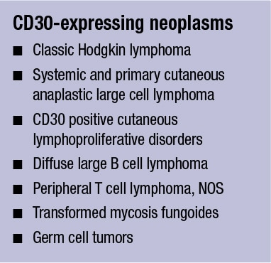 CD30 is consistently overexpressed on Hodgkin/Reed-Sternberg cells of classic Hodgkin lymphoma (CHL). However, CD30 expression is seen in a number of other neoplasms including: CD30 positive cutaneous lymphoproliferative disorders, systemic anaplastic large cell lymphoma (ALCL), adult T cell lymphomas, a subset of peripheral T cell lymphomas, most cases of transformed mycosis fungoides, a subset of B cell lymphomas (mostly diffuse large B cell lymphoma; DLBCL), and a subset of germ cell tumors (GCT) including embryonal carcinoma. CD30 expression in neoplasms has become of increasing importance with the development of and successful treatment with anti-CD30 monoclonal antibodies. Original attempts at anti-CD30 were unsuccessful as naked CD30 antibodies were rapidly endocytosed. Brentuximab vedotin is an anti-CD30 chimeric monoclonal antibody that is conjugated to the antimicrotubule agent monomethyl auristatin E. Brentuximab vedotin may be used to target a variety of CD30-expressing neoplasms (see box below). It is important to keep in mind that an unsatisfactory CD30 assessment by immunohistochemistry can be a barrier in identifying appropriate patients for CD30-targeted therapy.1 Interestingly, NordiQC had four runs for CD30 assessment over a 10-year period.2 CD30 staining assessment by NordiQC has shown a steady decline in achieving sufficient staining results, decreasing from 92 percent to 71 percent in 2015.