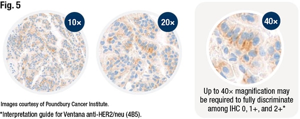 Making the distinction at the lower end of the spectrum of HER2 expression requires careful examination of the entire tumor, Dr. Tozbikian said. He recommends initially scanning the tumor at low magnification to evaluate for that presence of intratumoral heterogeneity. “To be able to detect low levels of HER2 expression requires that the pathologist carefully interrogate the tumor at higher power. There’s simply no avoiding this. It can’t be done at scanning magnification alone,” he said. In 2+ cases, the staining precipitates generally start to become visible at medium power using the 10× objective lens, “but to observe 1+ staining requires the pathologist to go to high power—generally the 40× objective lens” (Fig. 5). It’s difficult, he said, to detect or quantitate the level of subtle expression at low or medium magnification using a 5× or 10× objective. “So detection of tumors with low levels of HER2 expression will require pathologists to spend more time with their cases.” For difficult cases, he recommends measures such as reviewing the case with a second pathologist for consensus.