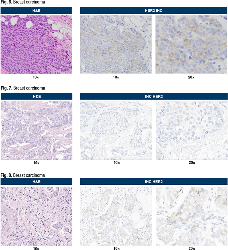 Further complicating the issue, he noted, is that intratumoral heterogeneity for HER2 expression is not uncommon. “It certainly adds to the interpretive challenge of HER2 evaluation and is a frequent cause of HER2 equivocal results.” Studies of HER2 nonamplified tumors with genomic heterogeneity have shown associations with larger tumor size, higher histologic grade, and frequency of lymph node metastasis (Marchiò C, et al. Semin Cancer Biol. 2021;72:123–135; Shafi H, et al. J Clin Pathol. 2013;66[8]:649–654), while in HER2-positive tumors there is published data that suggests intratumor heterogeneity for HER2 is associated with negative prognosis and lower pathologic complete response rates after neoadjuvant therapy (Filho OM, et al. Cancer Discov. 2021;11[10]:2474–2487; Lee HJ, et al. Am J Clin Pathol. 2014;142[6]:755–766).