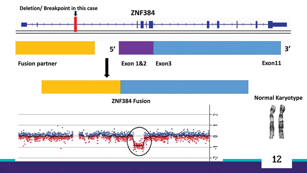 “That is the important part: Whenever you find these small alterations in microarray, usually the chromosomal analysis does not show anything specific.” If she had not found the ZNF384 rearrangement, Dr. Aggarwal says she would have sent the specimen out for additional testing.
