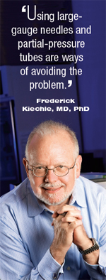 The addition of air to a sample can also cause hemolysis, Ernst says. “When the device used to draw the blood is not properly fitted—for example, the syringe is not properly fitted to the vascular access device—then air gets into the fitting, it foams up the blood, and instead of having nothing but straight liquid blood in your syringe, you end up with a bubbly mixture.” Hemolysis can occur because this “frothing” introduces more turbulence, or shear, into the sample as it’s withdrawn.