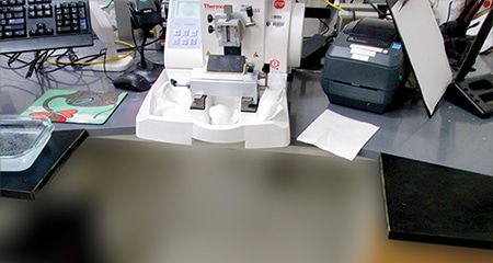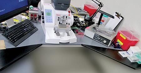 The same company that provided the wings for the microtome benches also provided them with a full benchtop with a cutout, so that it’s angled similarly, at 45 degrees. The benchtop was then placed on a powered height-adjustable base. “You can also put a microscope in the front so that the user is able to get in closer to the microscope and still have arm support.”