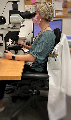 The microscope Dr. Bean uses now is superior ergonomically—lower stage, movable eyepiece—than microscopes of earlier years, she says. Still, even with this microscope, she was starting to have wrist, elbow, and shoulder pain. She assumed some of it was due to prolonged sitting and requested a sit-to-stand desk. Once it was in place, she called on Pentico to check her workstation, both the sitting and standing positions. “What do you see? What do I need to fix?” she asked.