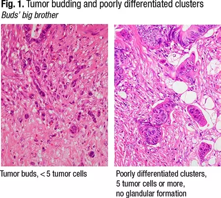 Tumor buds are an independent prognostic factor in most studies, she says, but their predictive value isn’t yet known. Anything with five or more tumor cells qualifies as a poorly differentiated cluster, or PDC. “PDCs are basically tumor buds’ big brother, and they have been shown to have a prognostic value on their own. There is no consensus upper limit of the PDC. Many studies just use an arbitrary cutoff of up to 20 cells.” (Fig. 1).