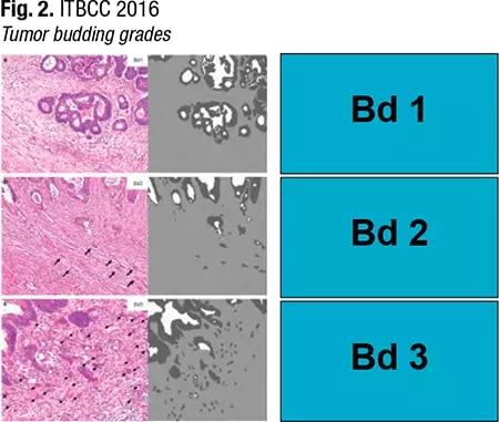Members of the ITBCC intentionally chose a three-tier system because it accommodates clinical situations that have different clinical endpoints. “So you can use a three-tier system for endoscopically resected pT1 colorectal cancers where having Bd1 is okay, but as soon as you get into Bd2 or Bd3, this is considered a risk factor for lymph node metastases.” A three-tier system can also be used for stage II patients, where the endpoint is tumor recurrence and patient survival, Dr. Dawson says. “So you have to set your threshold a bit higher. And in these cases, Bd1 and Bd2 are tolerated, and only Bd3 is considered a risk factor.” (Fig. 2).