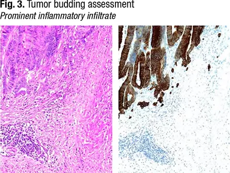 Sometimes, especially in MSI-high tumors, pathologists will see a prominent inflammatory infiltrate that can make it challenging to find the buds, Dr. Dawson warns. “A keratin stain will highlight the tumor buds, and it will make things a bit easier for you.” (Fig. 3).
