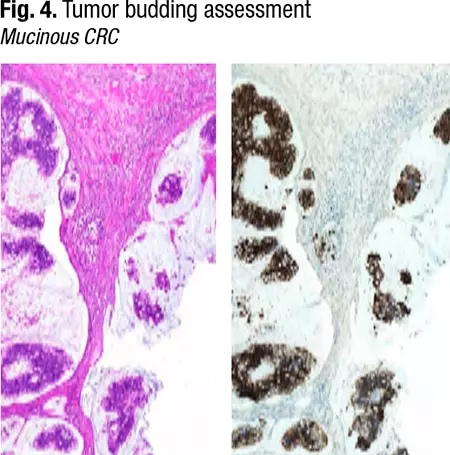 Dr. Dawson also cautions that mucinous cancers sometimes produce a lot of mucin and the tumor cells become trapped in mucin pools. “The real tumor buds, the real deal, are able to migrate through tissue. The migration through tissue is what is going to get them into the vessels, the lymph nodes, the liver, the lungs and everywhere,” she says. “Tumor buds need to be in tissue and not in a mucin pool.” (Fig. 4).