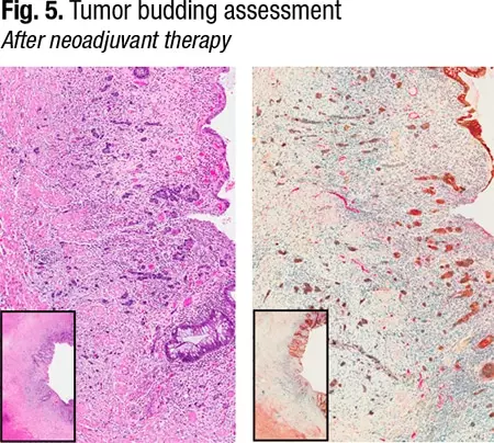 After neoadjuvant therapy, tumor budding is not reported because it’s too hard to discriminate which cells are just residual tumor cells after therapy and which ones are the tumor buds, although some studies point toward tumor budding as an adverse marker for survival in these patients, she says. The pathologist can say that tumor budding is often not applicable in these cases (Fig. 5).